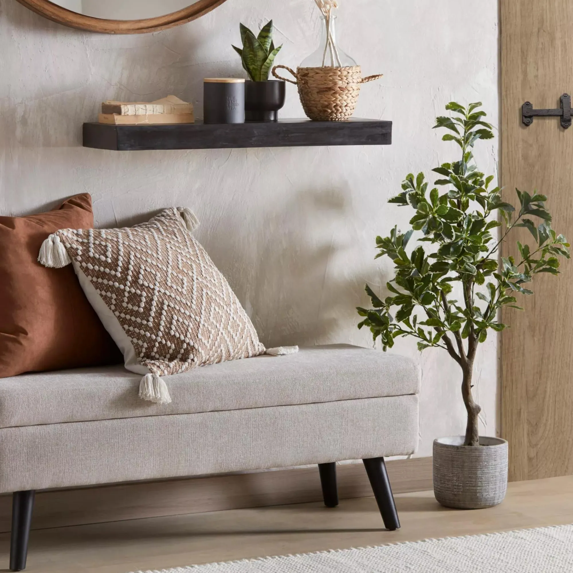 Bring a touch of nature to your decor and you’re sure to set a scheme that’s warm and welcoming. The leaves of this artificial botanical have such a lifelike appearance you’ll be hard-pressed to see that it’s a faux floral. Potted in a scratched cement pot it has modern appeal with Beige flair.